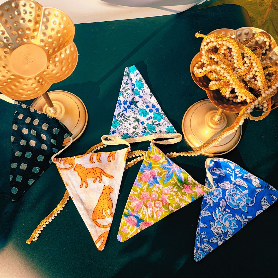 Each string of these buntings is unique as they are manufactured from leftover fabric. Tie one up to instantly illuminate any door entrance, window , gallery or bring a festive splash of color to your workspace..