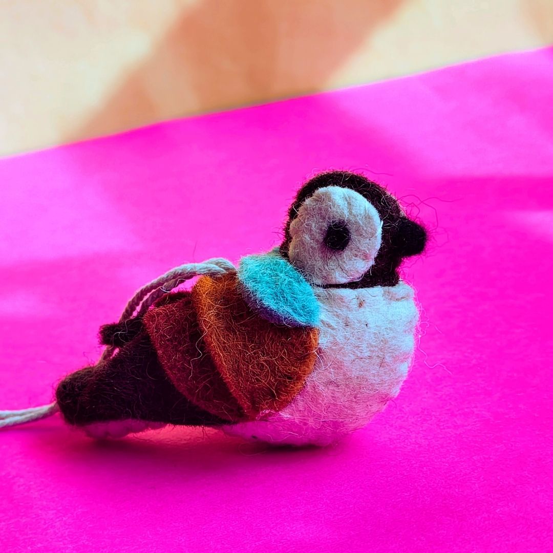 Gift your little ones a world of imagination and a non-toxic choice of playtime.This charming felt bulbul chidya is needle-felted with love by skilled artisans features a built-in hanging loop, making it a versatile accessory for your car’s rearview mirror, a nursery wall, or a stylish home office.. In a world filled with plastic this felt fabric toy is safe for curious hands. The organic texture of wool stimulates a child's sense of touch, encouraging sensory play and fine motor skill development.