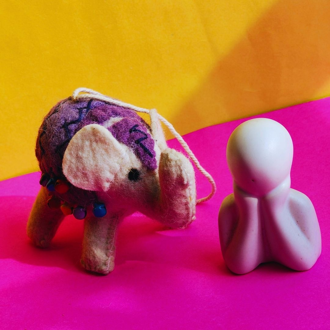 Elevate your child’s playtime with our cute handcrafted felt elephant rangeela haathi, this cute elephant is needle-felted with love by skilled artisans. Lightweight, soft, and easy for small hands to grip it is a meticulously designed sensory experience.Traditional ghunghroo bells for auditory play and makes it a cute rattle too.