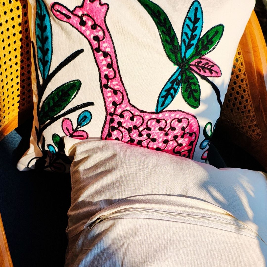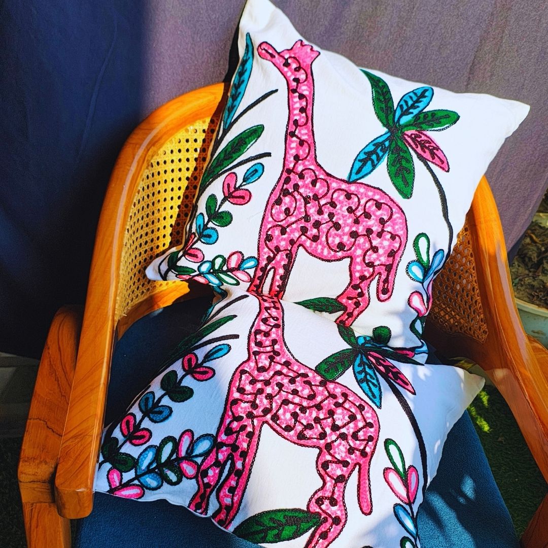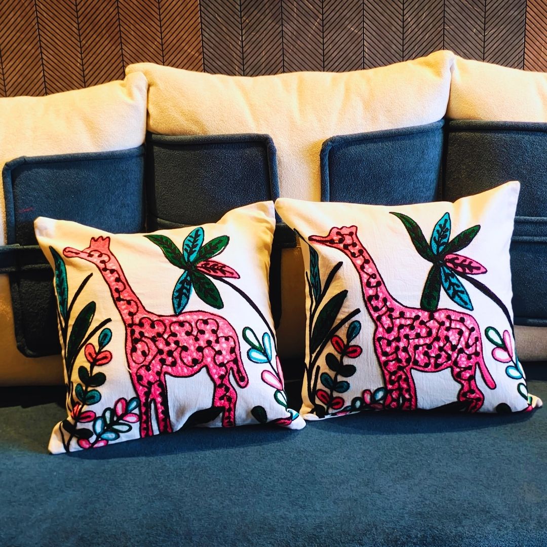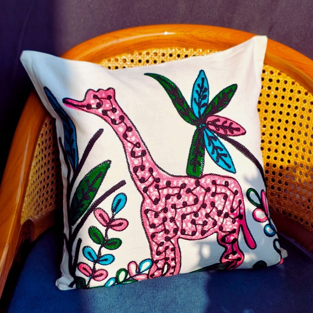 Suzani hand embroidery on this handcrafted cotton cushion cover adds a touch of cultured elegance to any room in your house. The cute Giraffe pattern and dewy white colour give the combo a soothing and pleasant vibe.