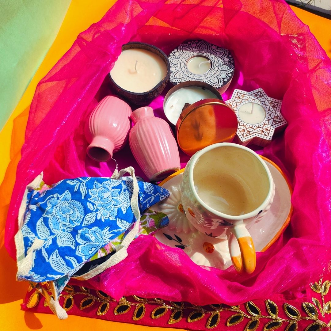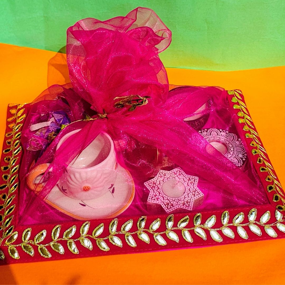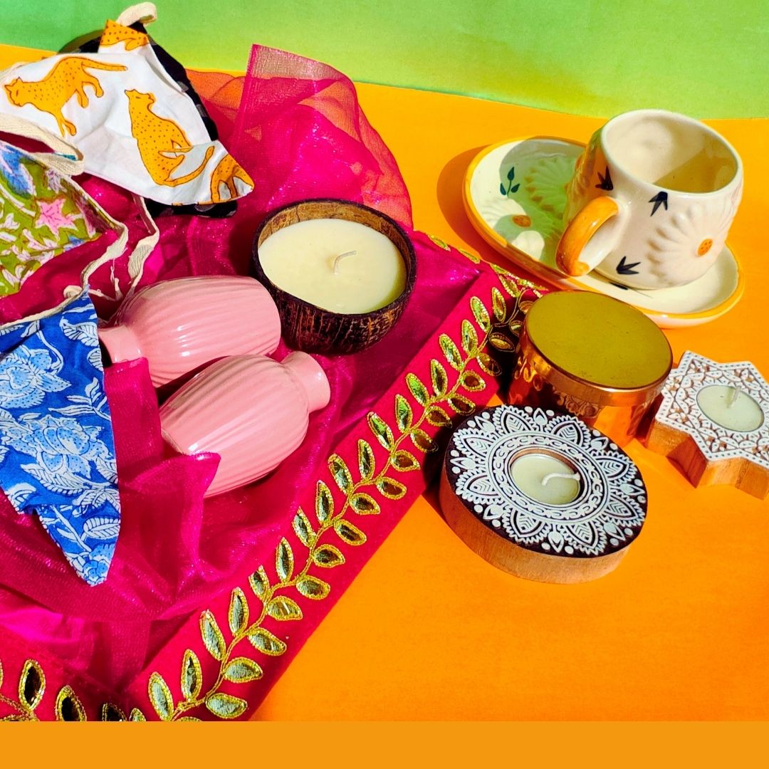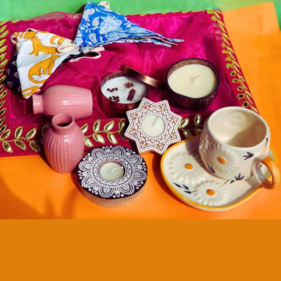 This colorful Gift Set is vibrant, cool, fun and purposeful. Comprises of reusable fabric toran, mug and tray set, mini vases and scented candles this tray is all thing fun reminding Diwali. Gift it to your loved ones or indulge in self-love. This Diwali tray gift hamper is all about the sparkle of Diwali