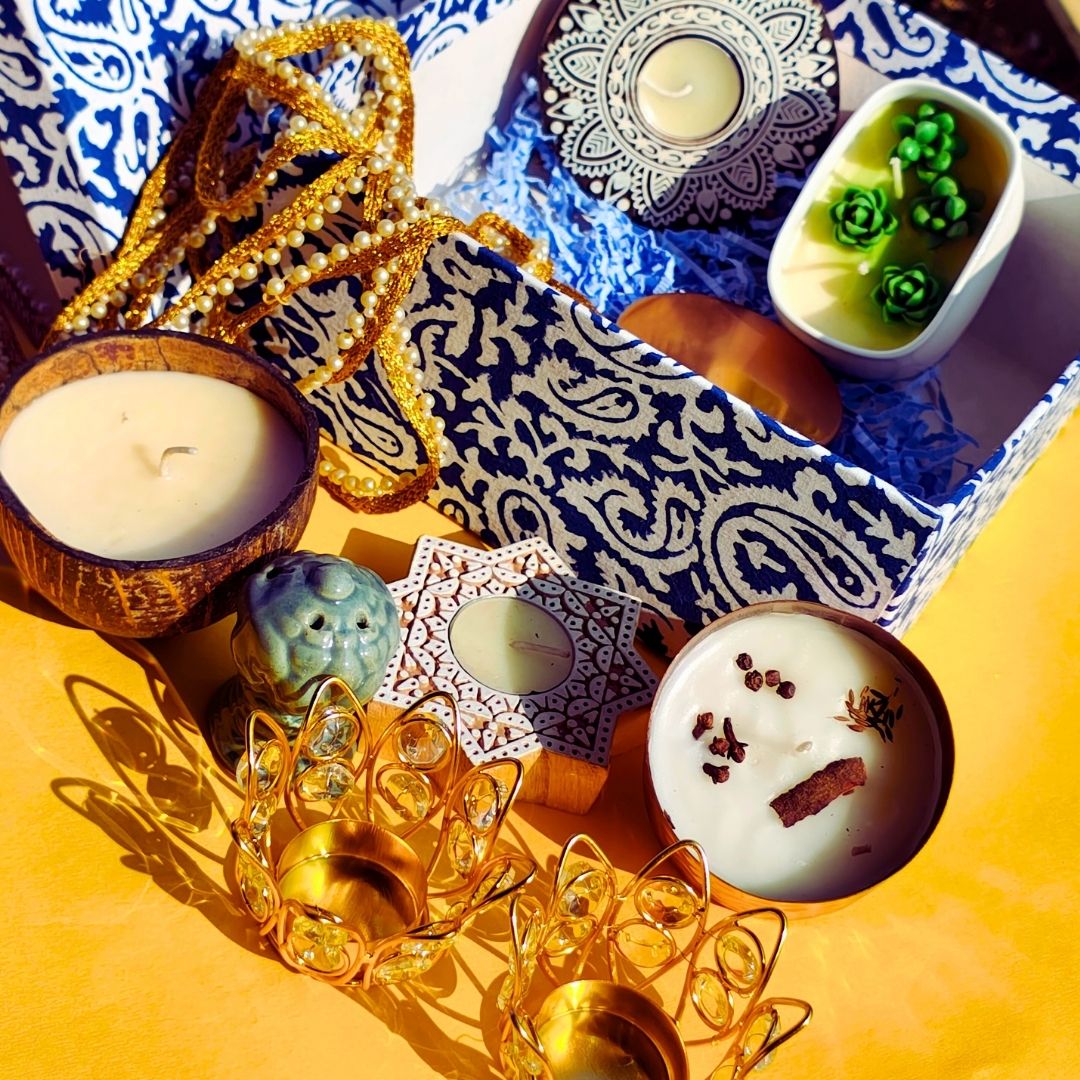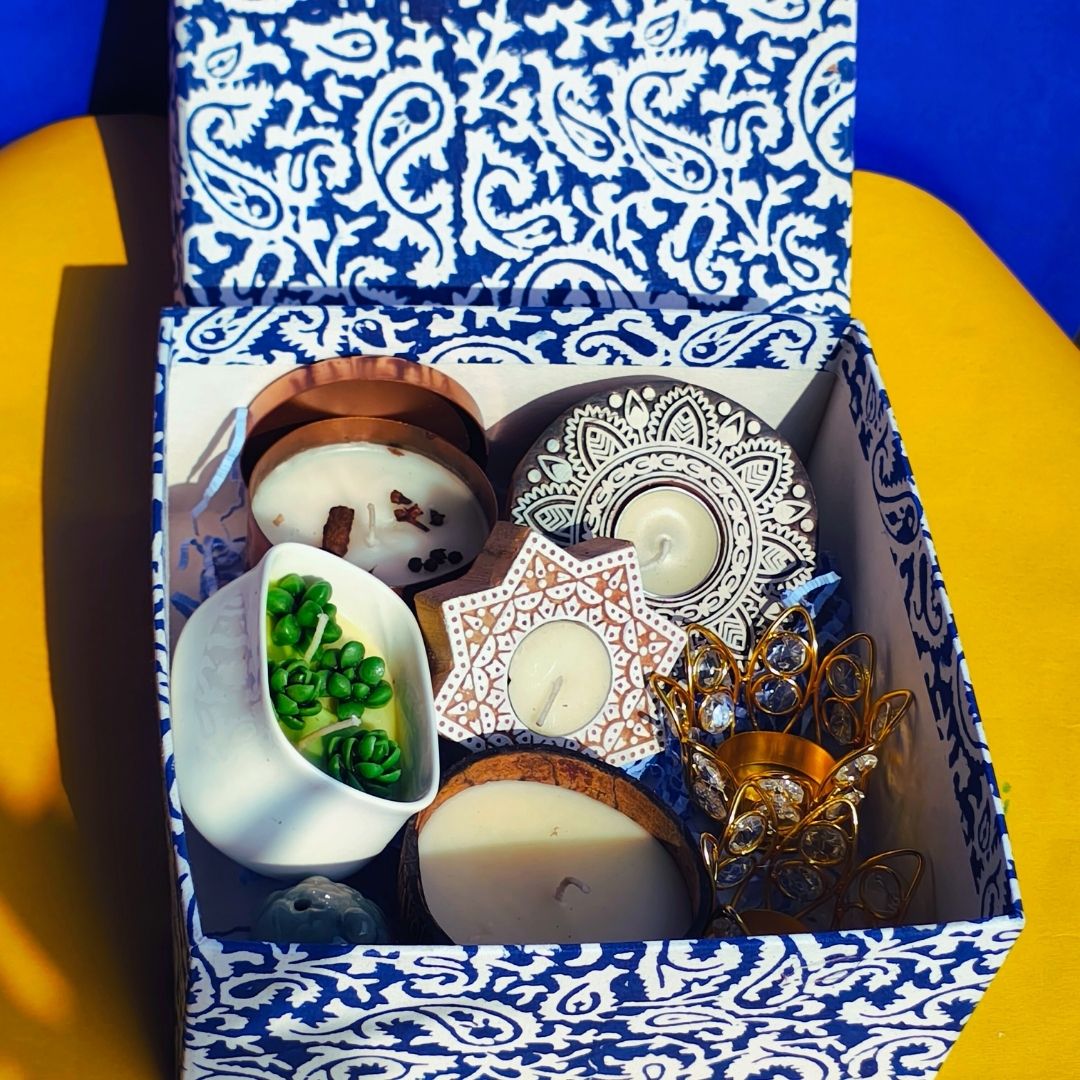 This colourful Gift Set is vibrant, cool, fun and purposeful. Comprises of handmade scented candles & decor, this gift box is all things fun, reminding of Diwali. Give it to your loved ones or indulge in self-love. This Diwali tray gift box is all about the sparkle of Diwali