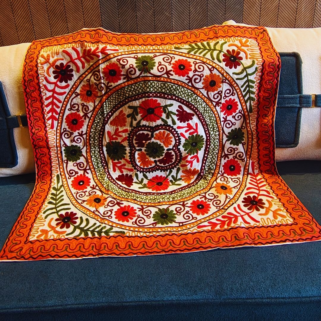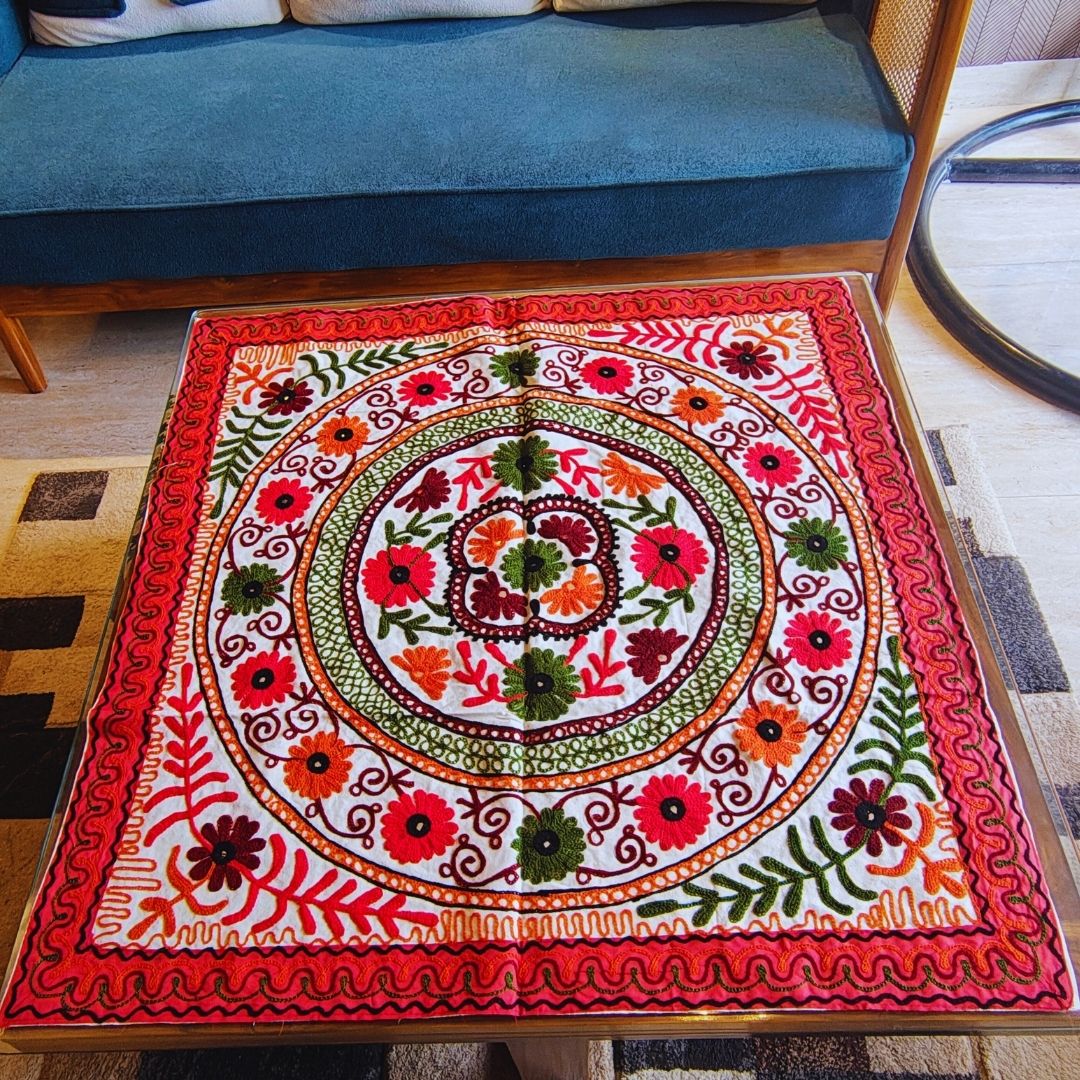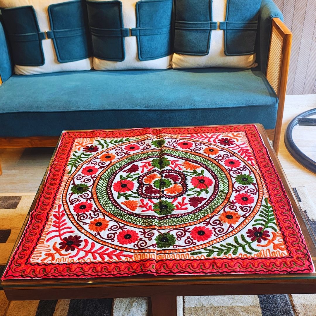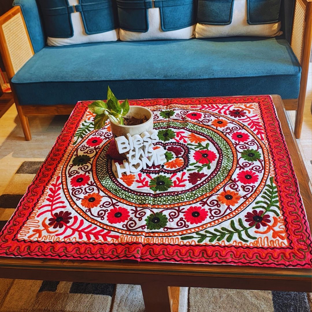 This delightful hand-embroidered tabletop cover/ wall hanging will look great in your home. It adds elegance and charm to your living/ dining area because it is made with detailed hand embroidery on soft cotton fabric.