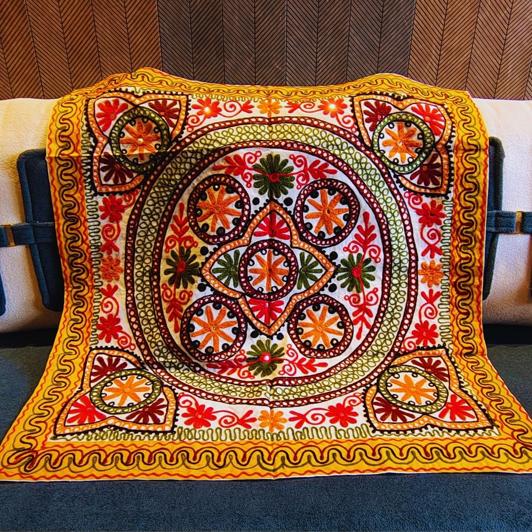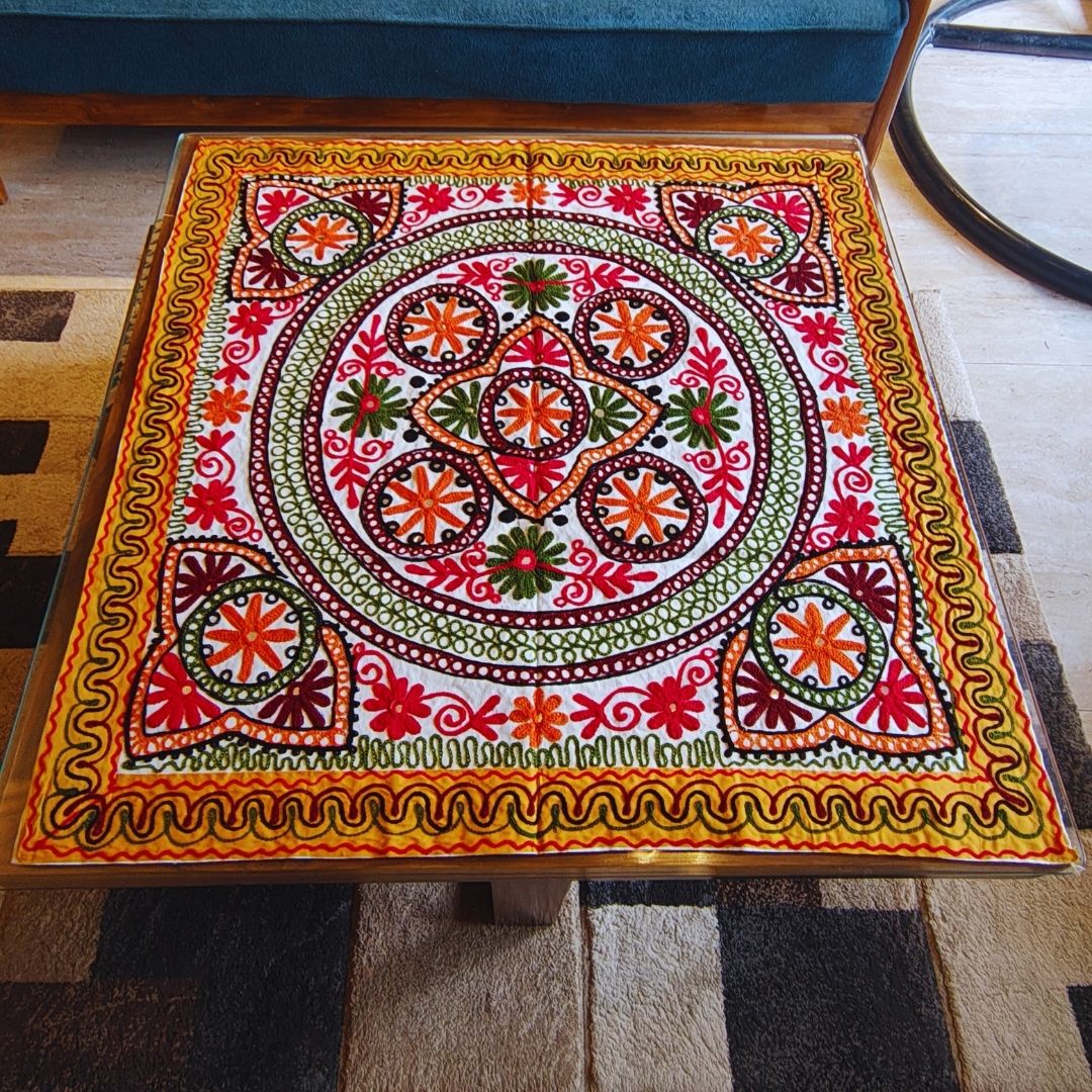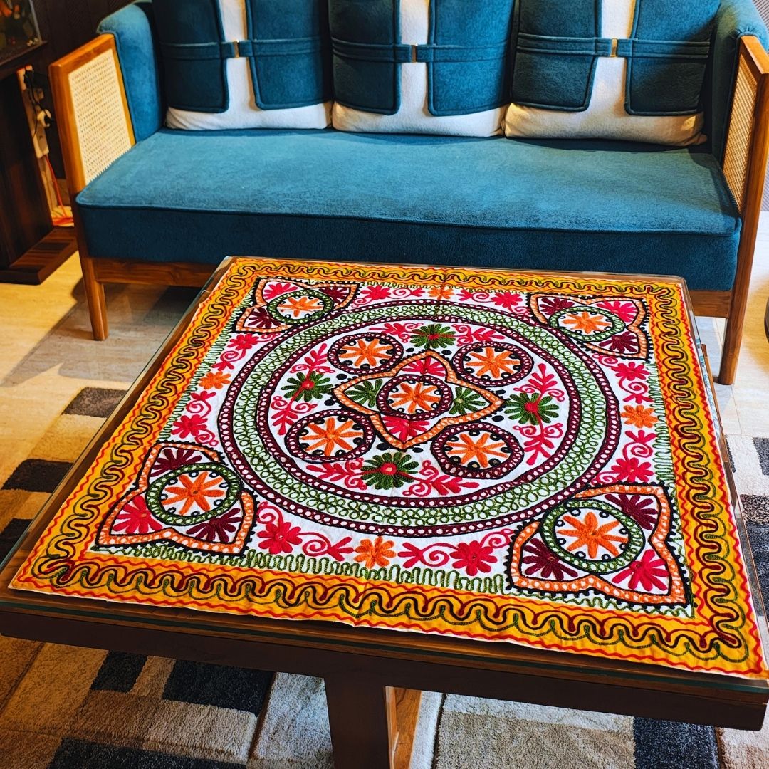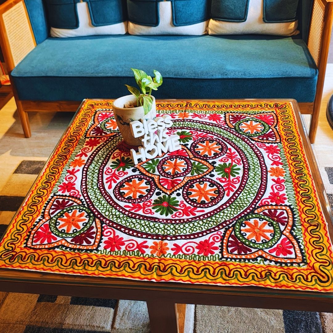 This delightful hand-embroidered tabletop cover/ wall hanging will look great in your home. It adds elegance and charm to your living/ dining area because it is made with detailed hand embroidery on soft cotton fabric.