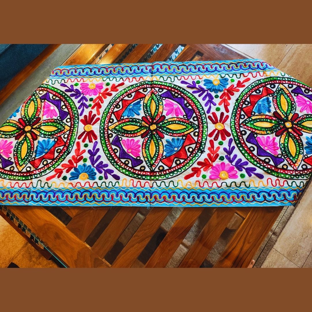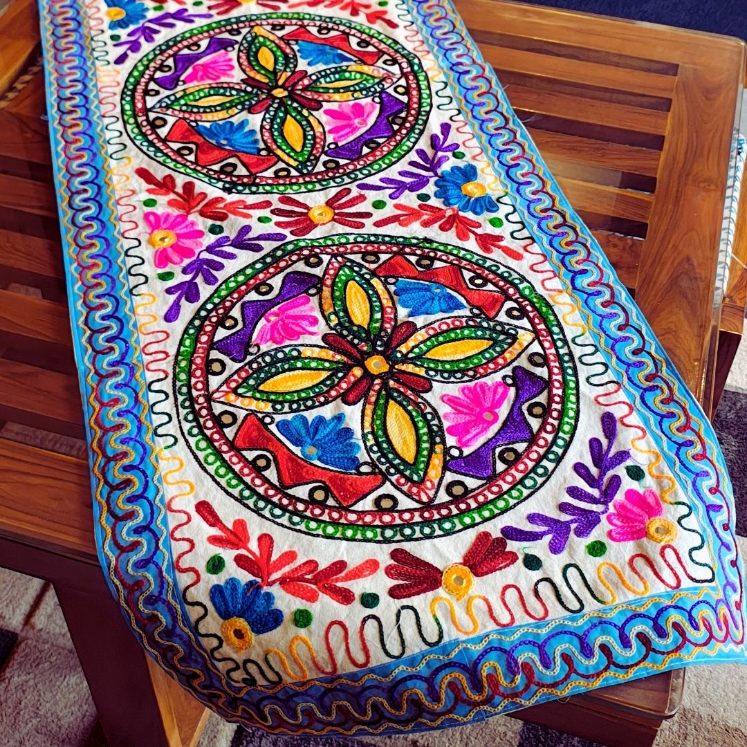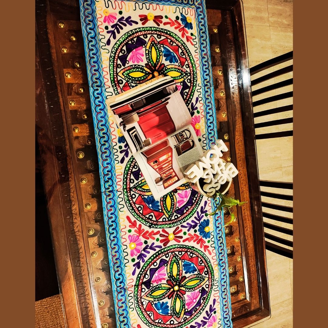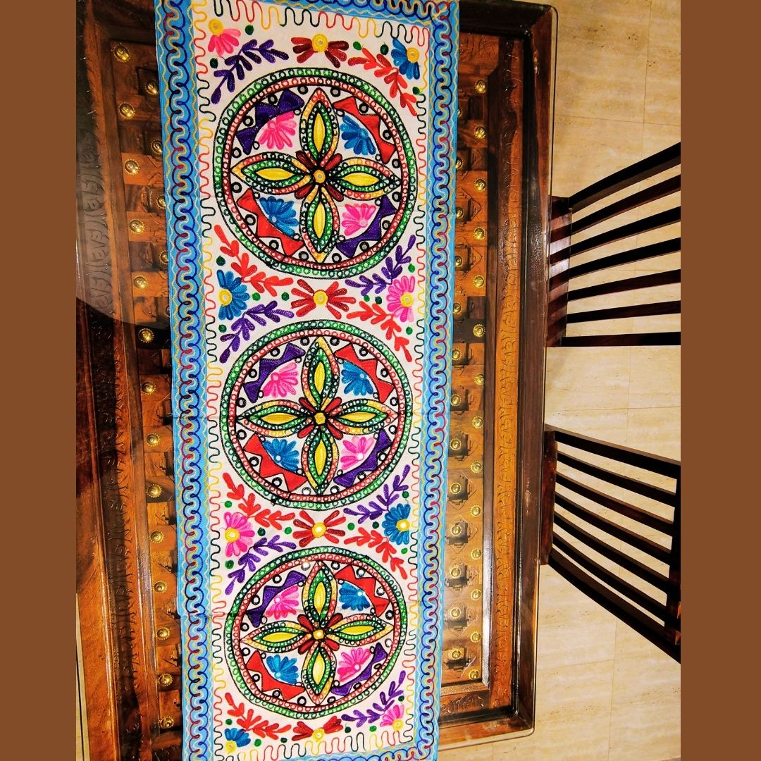 • This delightful hand-embroidered tablerunner/ wall hanging will look great in your home. It adds elegance and charm to your living/ dining area because it is made with detailed hand embroidery on soft cotton fabric.