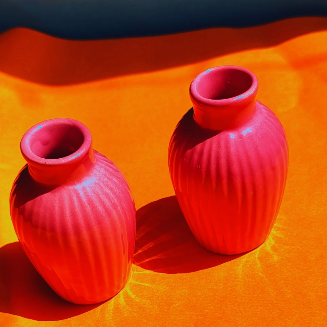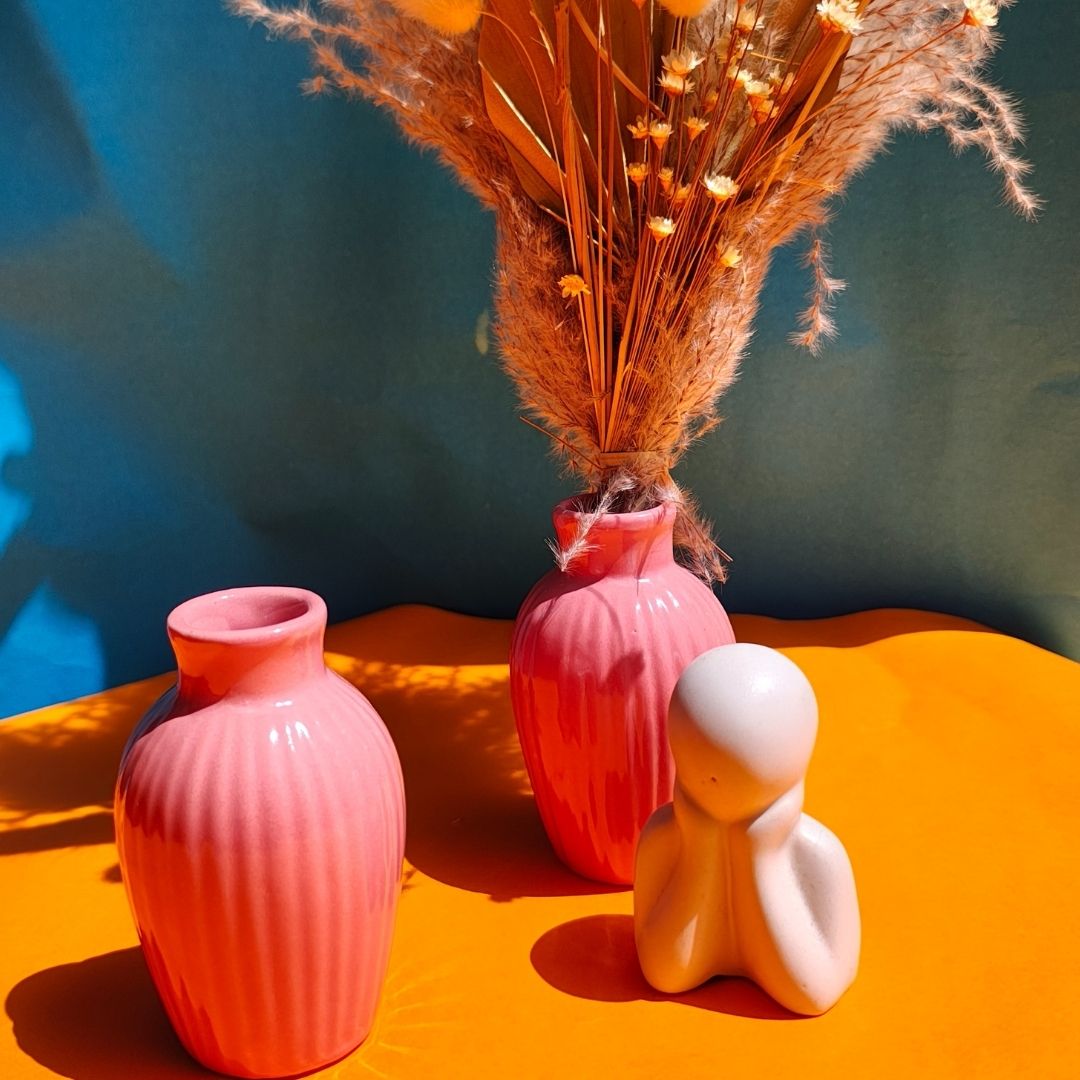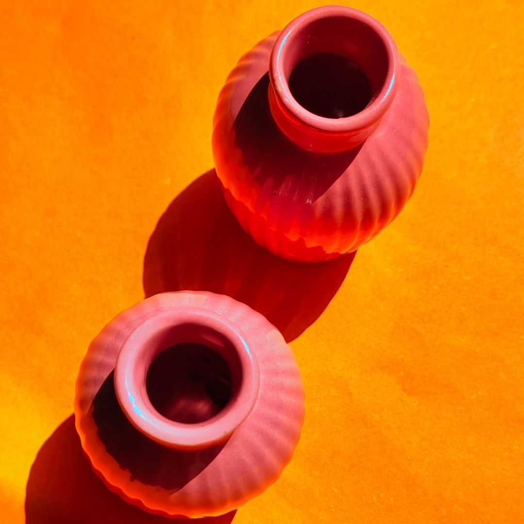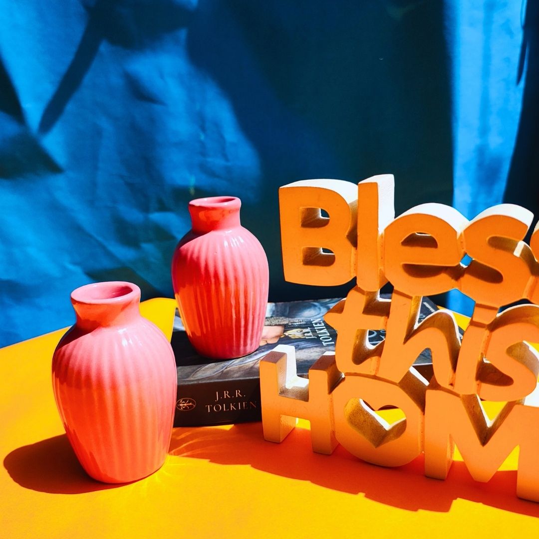 This beautiful set of two cute small vases is intended to add colour to the dull areas of your home. Use them with or without flowers; this adorable set creates a lovely design element. Its gentle colour is pleasing to the eye and complements any room decor design style.