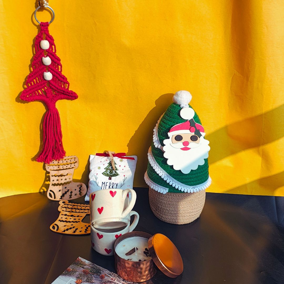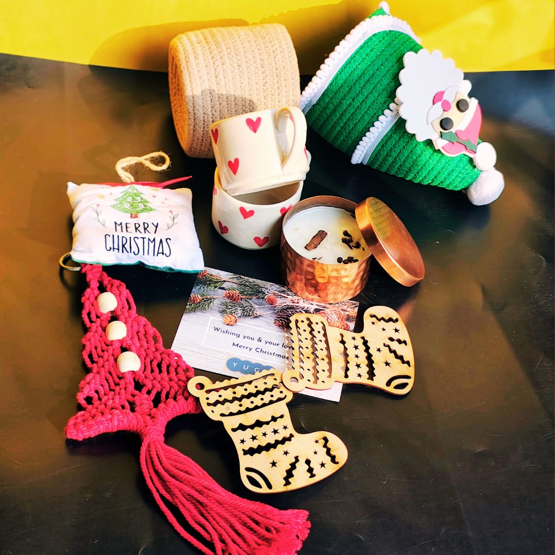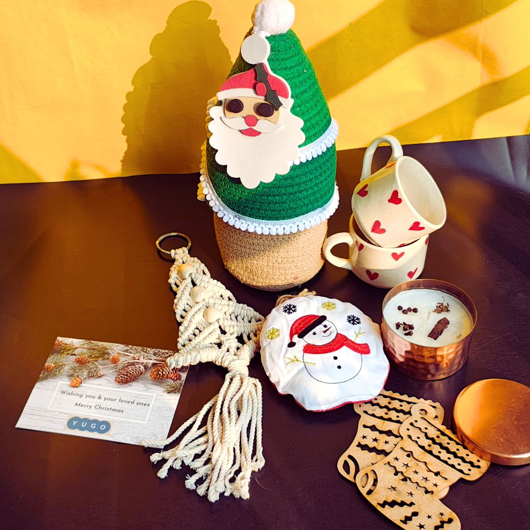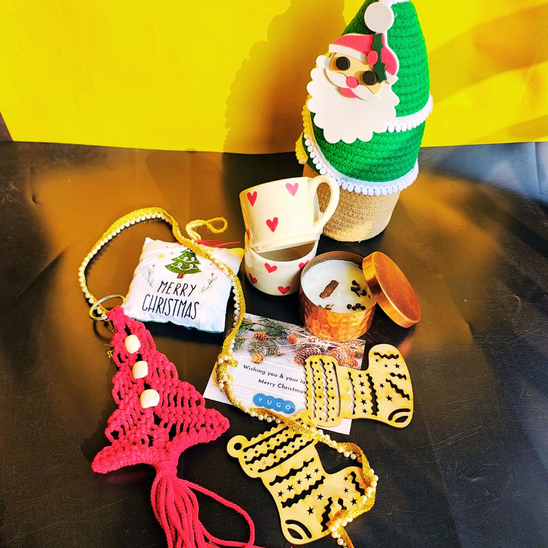 This assorted Christmas gift hamper is all about festivity and togetherness. This hamper includes an assorted collection of handmade mugs, a candle and Christmas ornaments packed in a cute Santa gift box.