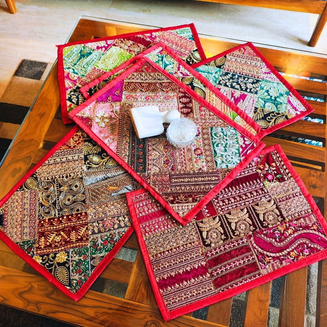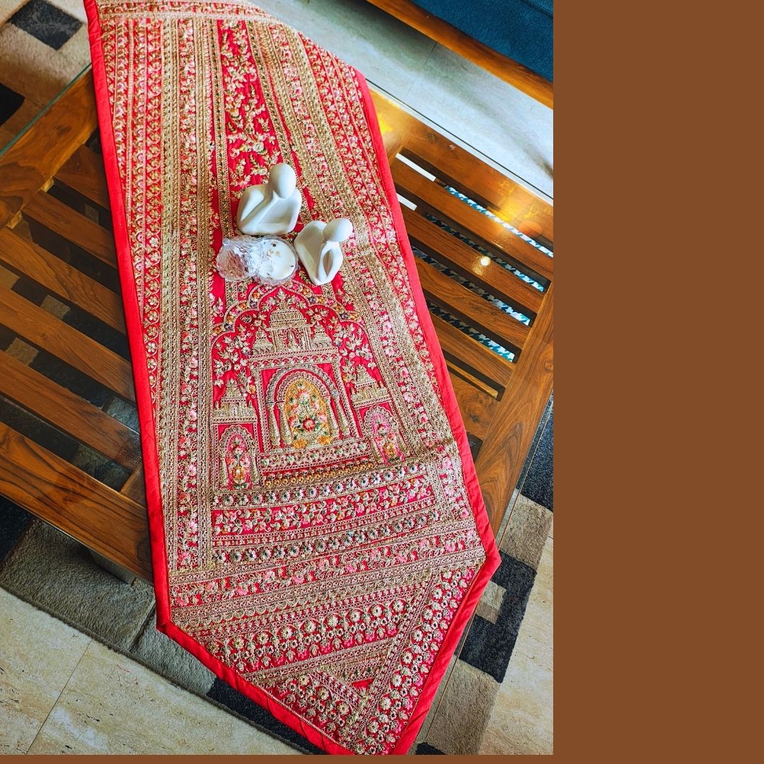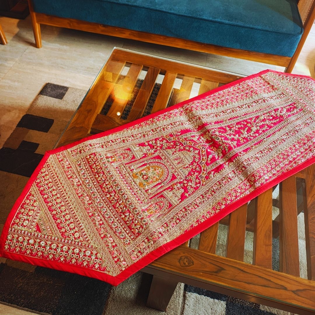 Go Maximalist this season with our zari embroidery table furnishing. Designed for those who love rich, maximalist decor, these pieces instantly elevate your dining and living spaces with royal charm. Each table furnishing is carefully handcrafted using multicolored metallic zari threads embroidered onto a premium fabric base. The intricate patterns reflect traditional craftsmanship and cultural heritage, giving your home a refined and majestic look.