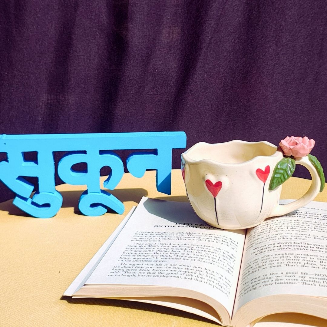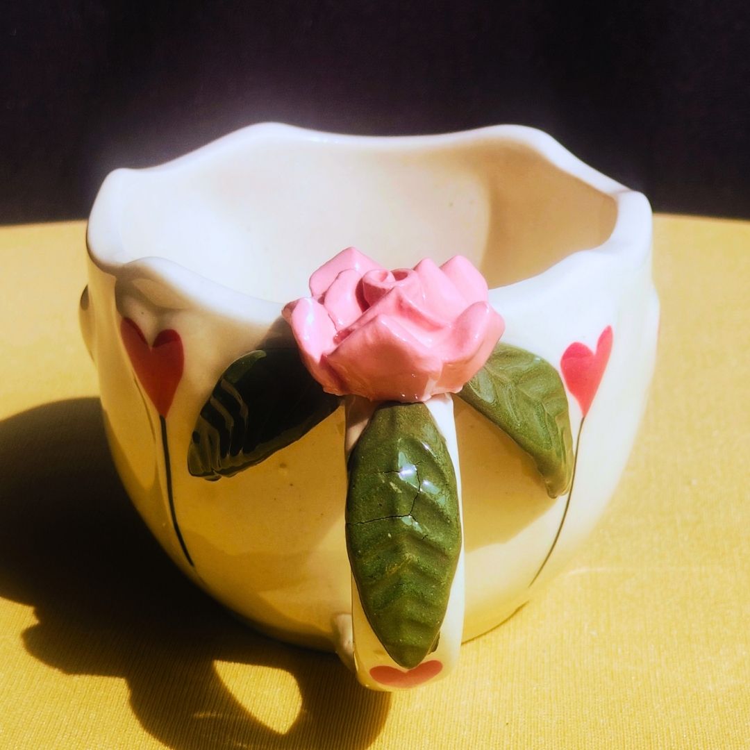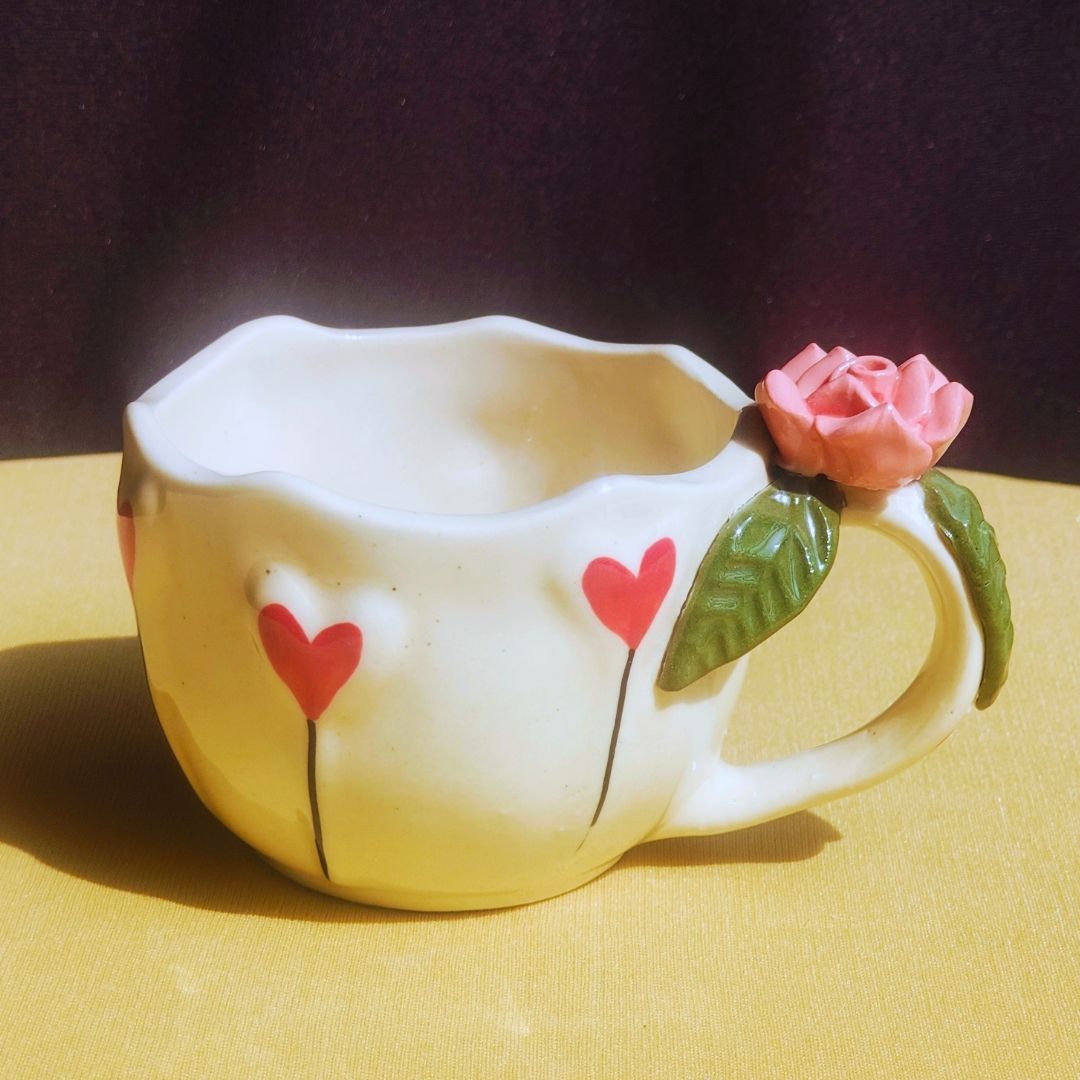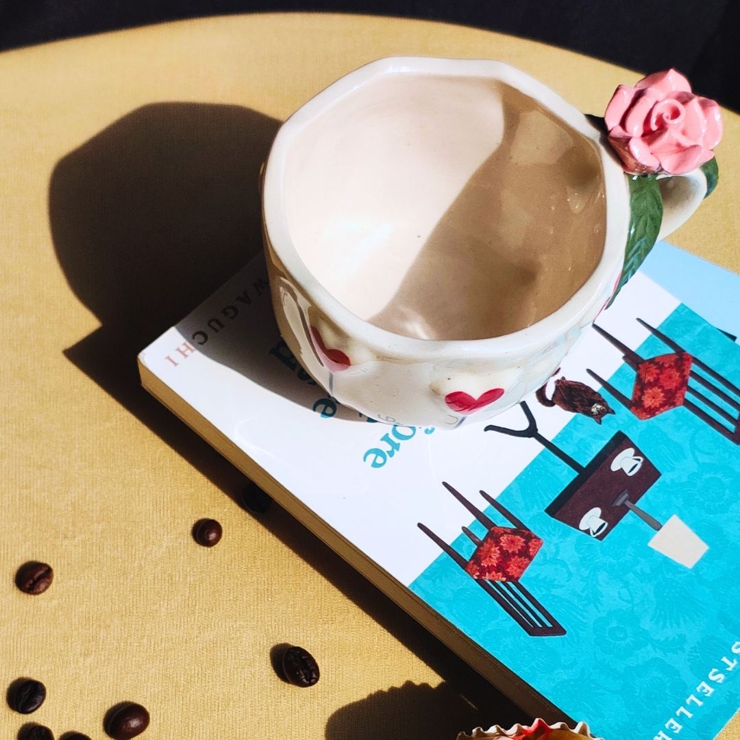 Add a little love to your everyday sips with this beautifully handcrafted ceramic cappuccino mug. Thoughtfully hand-shaped and hand-painted, this mug features 3D bold red hearts and 3D Rose on the ergonomic handle, making it a perfect showpiece mug that instantly brightens your mood and your table.
