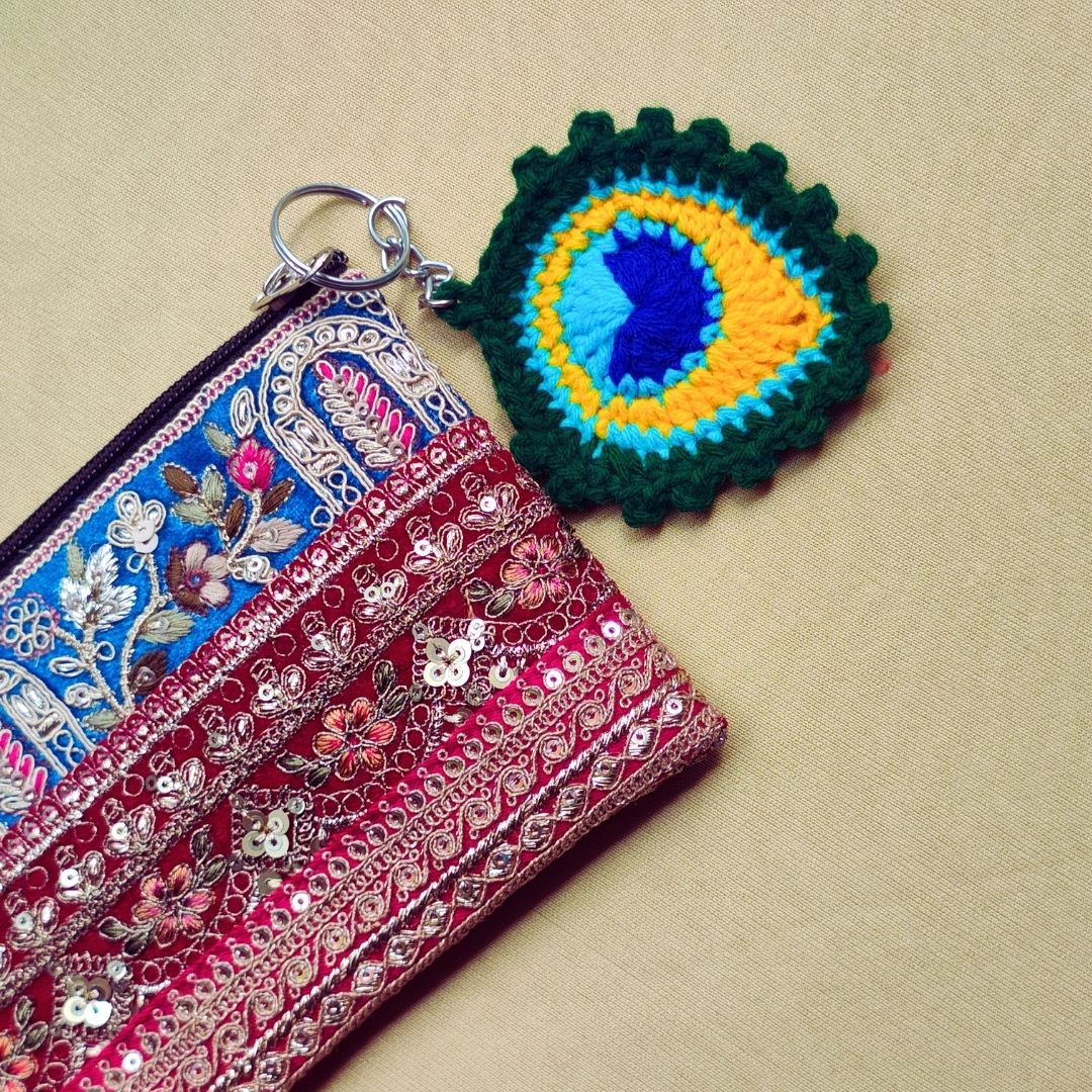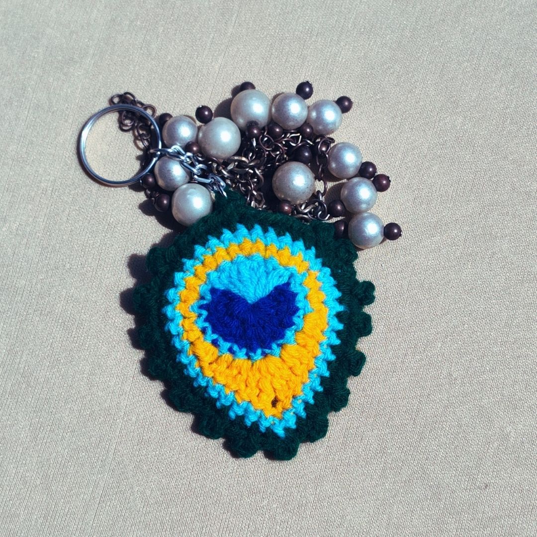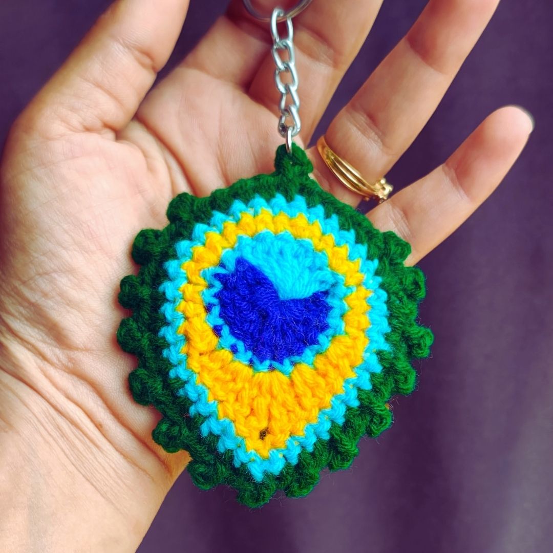 Add a pop of color and a touch of handcrafted charm to your everyday essentials with this beautifully crocheted peacock feather keychain. Carefully handmade with vibrant yarn, this unique accessory captures the elegance of a peacock feather in a fun, artistic way.